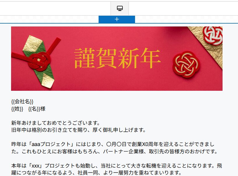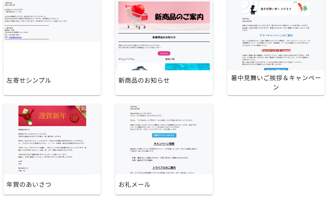 - 「しっかり感」を演出…視覚的に整ったメールは、それだけで「丁寧な会社だな」という信頼感につながります。年賀状をゼロからデザインを外注したり作成したりする必要もなく、システム標準のテンプレートが肩代わりしてくれます。