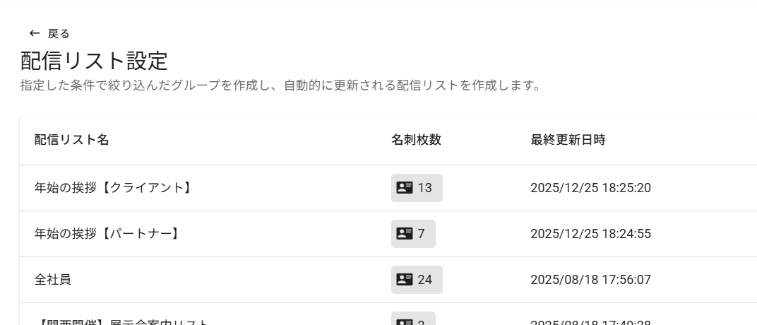 ネクスタ・メイシは名刺管理アプリと紐づいているため、顧客リストの作成は不要です。タグ付けや配信リストを活用することで、特定のセグメントに向けたオリジナルのメッセージなども作成することが可能です。