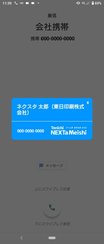 ネクスタメイシのモバイルアプリではアプリをインストールしていると、自分が登録している名刺の番号から着信があった際に発信者の情報を表示することができます。