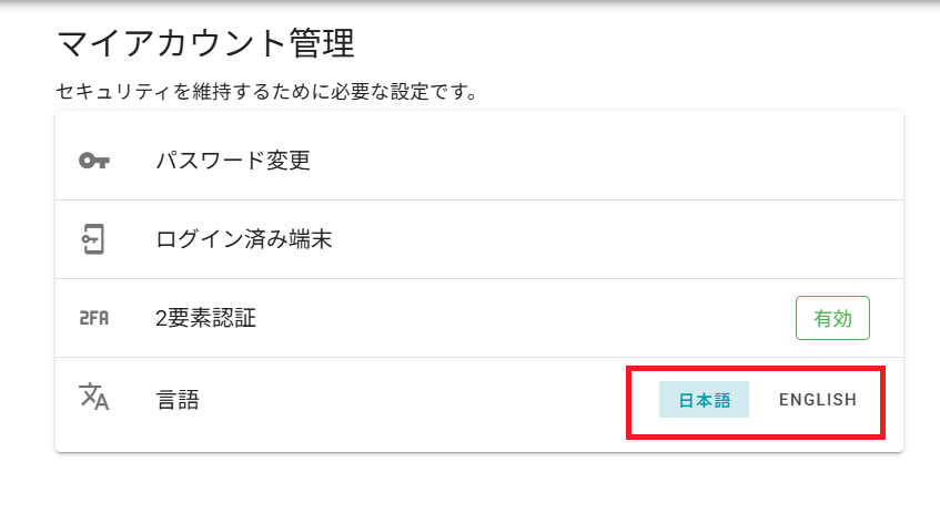 なお、右上のアカウントの「マイアカウント管理」からも変更が可能です。