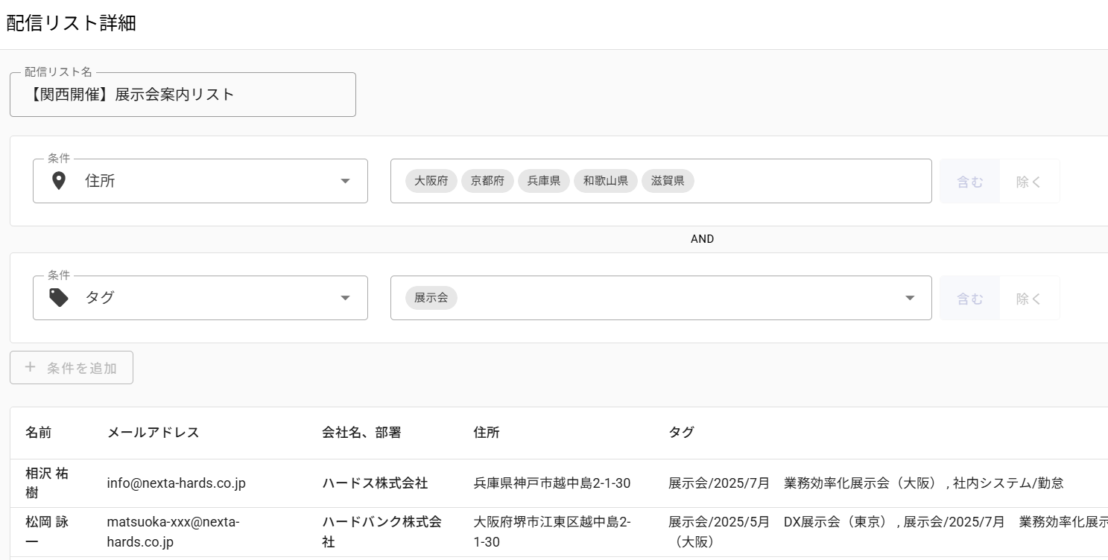 名刺交換日、所有者、タグ(「展示会来場」「既存顧客」など)、住所など特定の条件を組み合わせて、送信対象をピンポイントで抽出します。