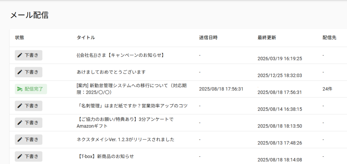 | 定期的な「掘り起こし」メール | 過去に名刺交換をしたものの、しばらく連絡が途絶えてしまっている見込み客への再アプローチにも有効です。 新製品の案内や業界のトレンド情報を定期的に配信することで、顧客との接点を維持。タイミングを逃さず、休眠顧客の掘り起こしを実現します。 |